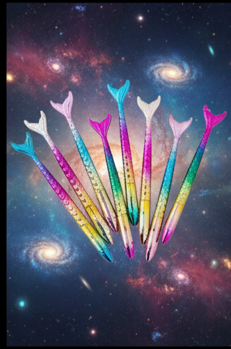 * **طراحی خیرهکننده دم پری دریایی:** هر رواننویس با دقت و ظرافت، طرحی از دم پری دریایی را به نمایش میگذارد که با رنگهای گرادیانی و درخشان، چشم هر بینندهای را به خود خیره میکند. این طراحی منحصر به فرد، قلم شما را از هر قلم دیگری متمایز میکند.
